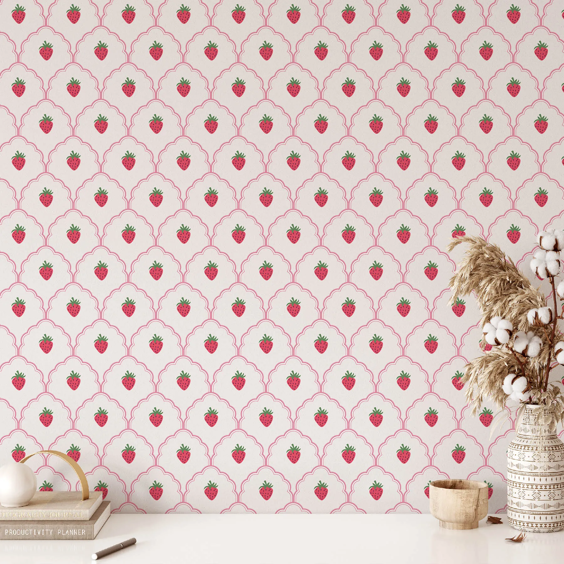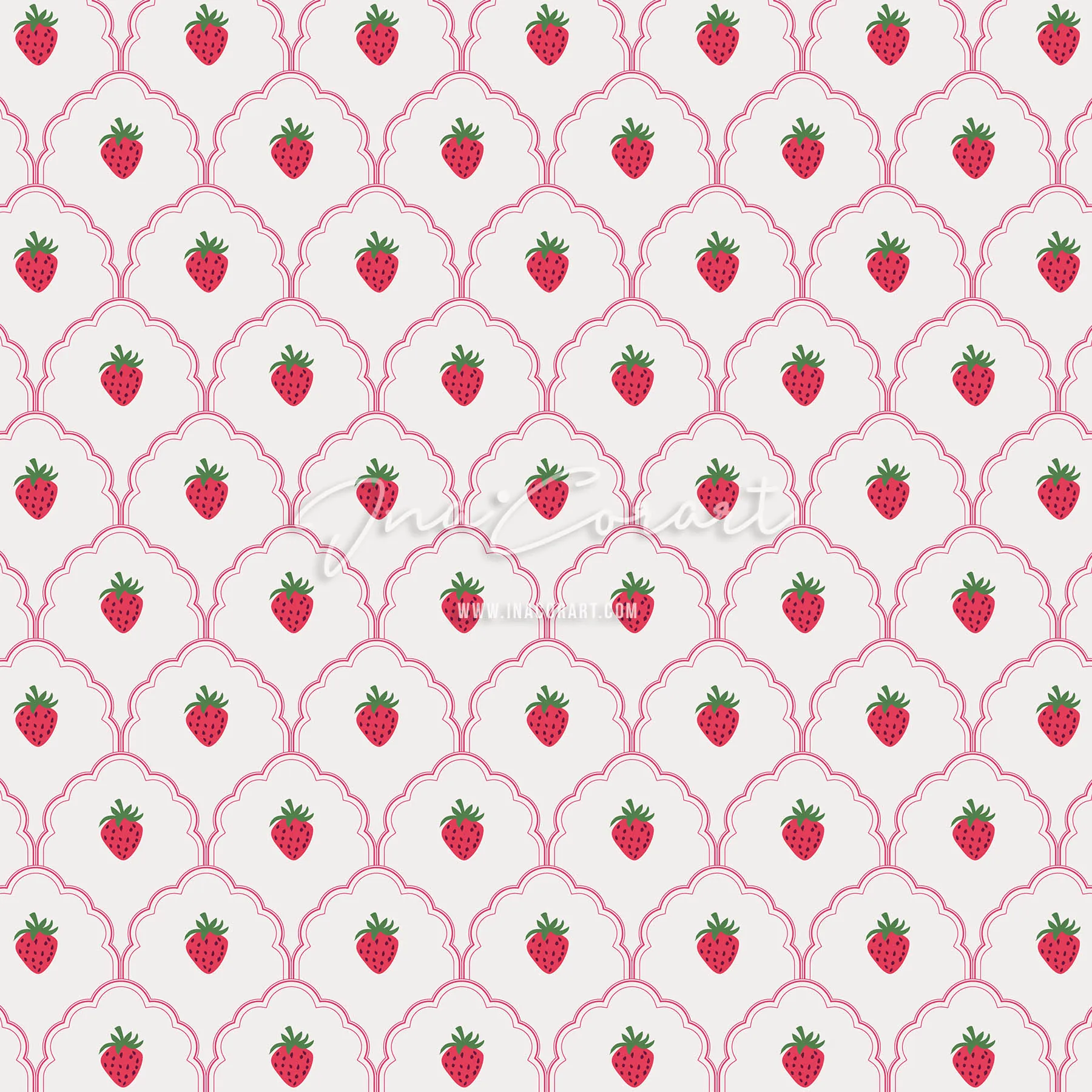 This charming seamless pattern showcases vibrant strawberries nestled within elegant scalloped shapes. Perfect for adding a fresh and fruity touch to your designs, this pattern is versatile for various applications, from textiles to wallpapers.