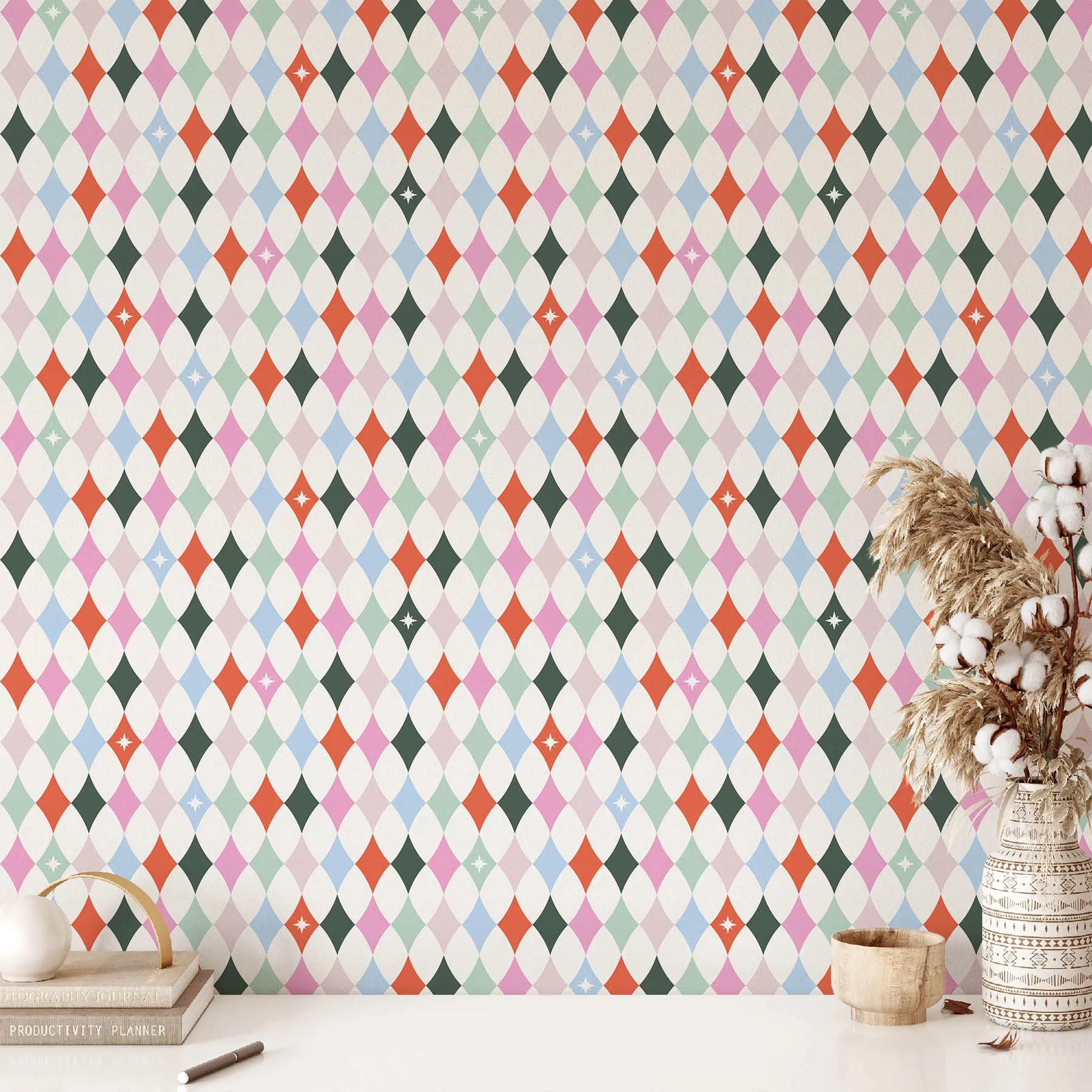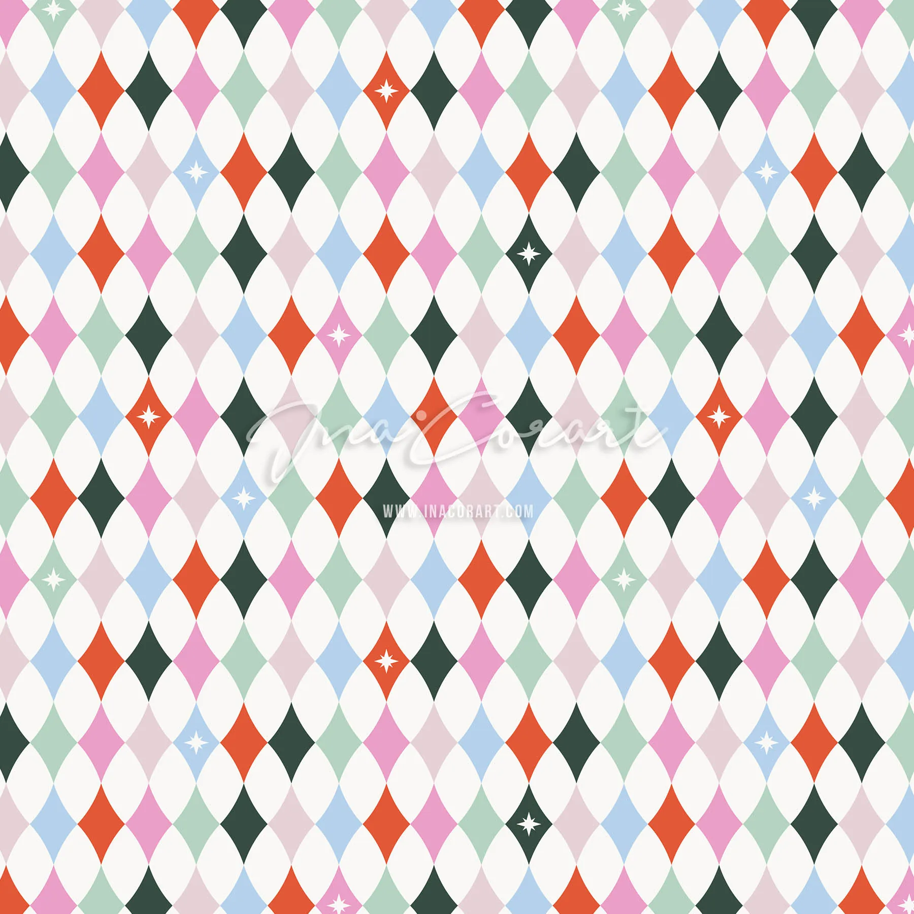 This delightful repeat pattern showcases a playful arrangement of colorful diamonds in a variety of hues, perfect for adding a cheerful touch to any project. The design features a mix of pastel and bold colors, creating a dynamic visual effect that is both modern and timeless.
