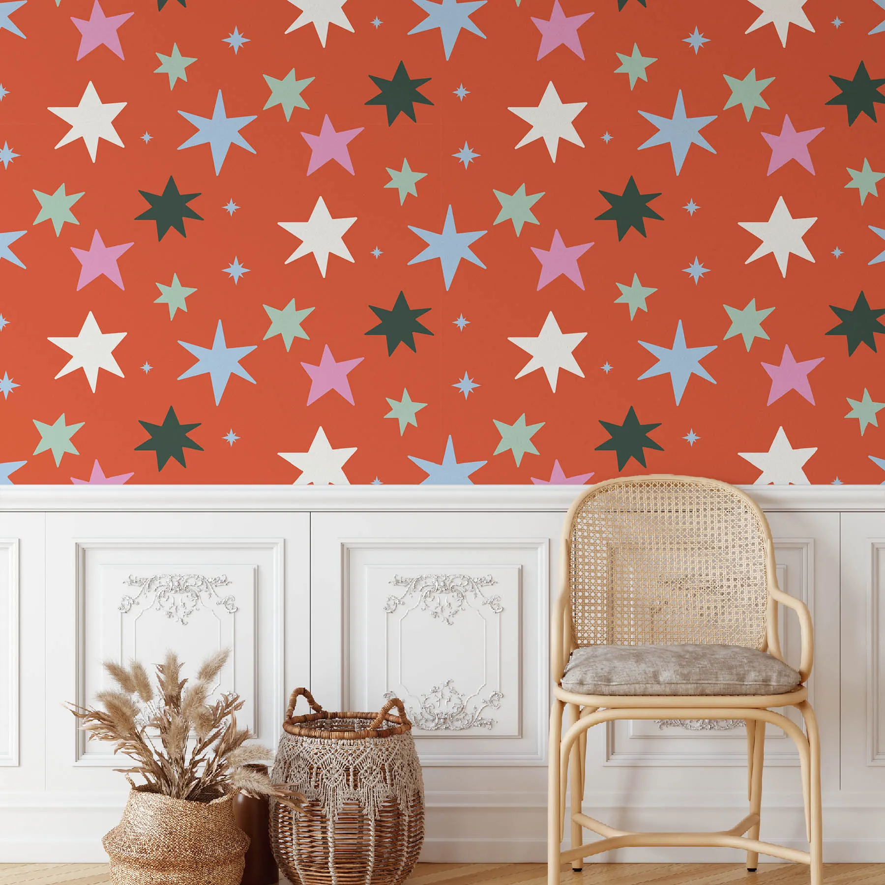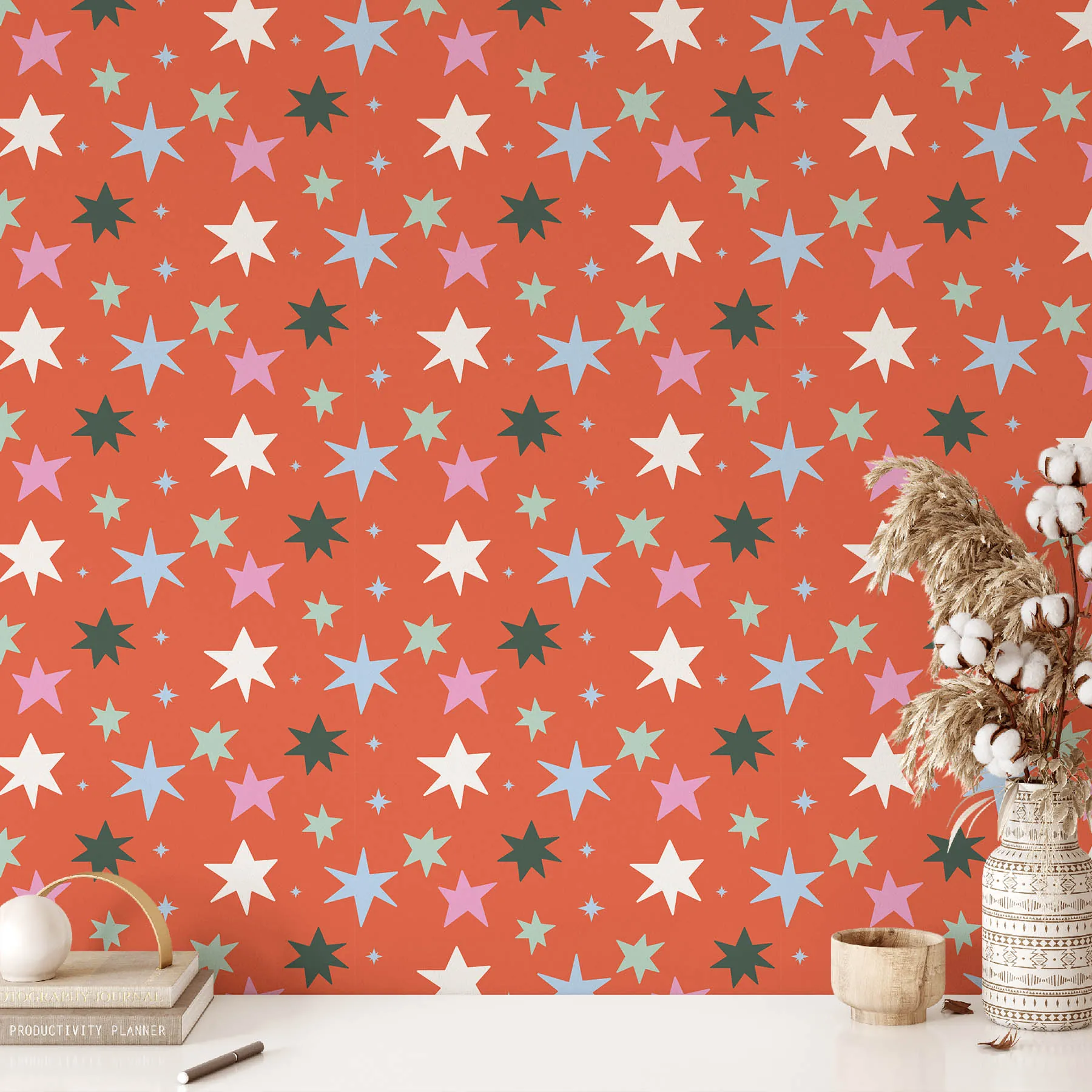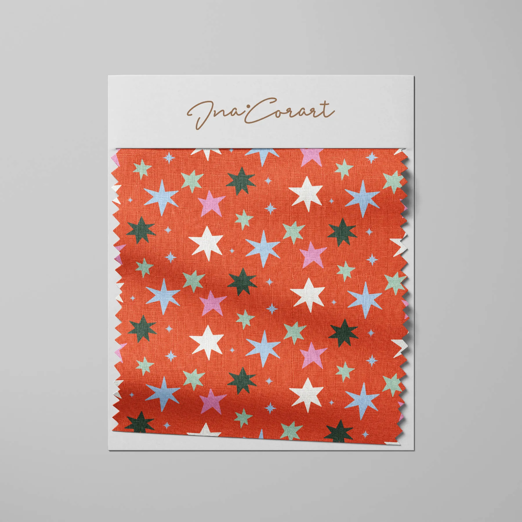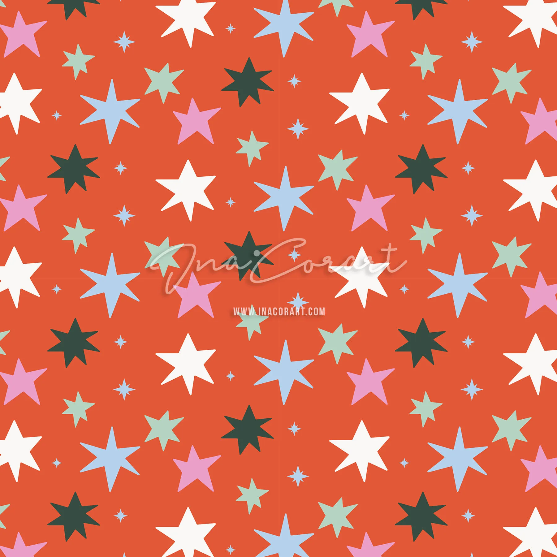This seamless pattern showcases an array of colorful stars on a bold orange background. Perfect for adding a playful touch to any design project, this pattern is versatile and eye-catching.