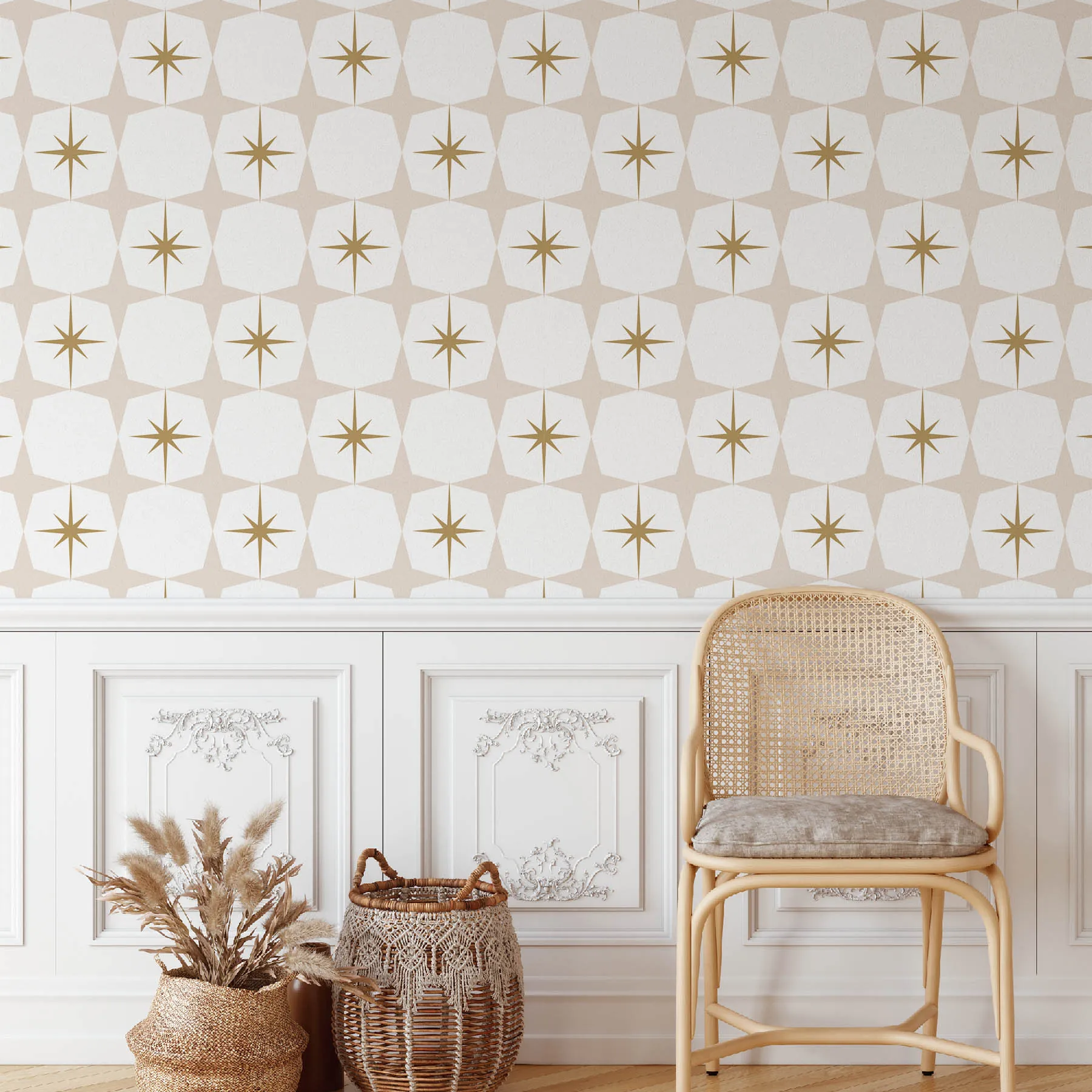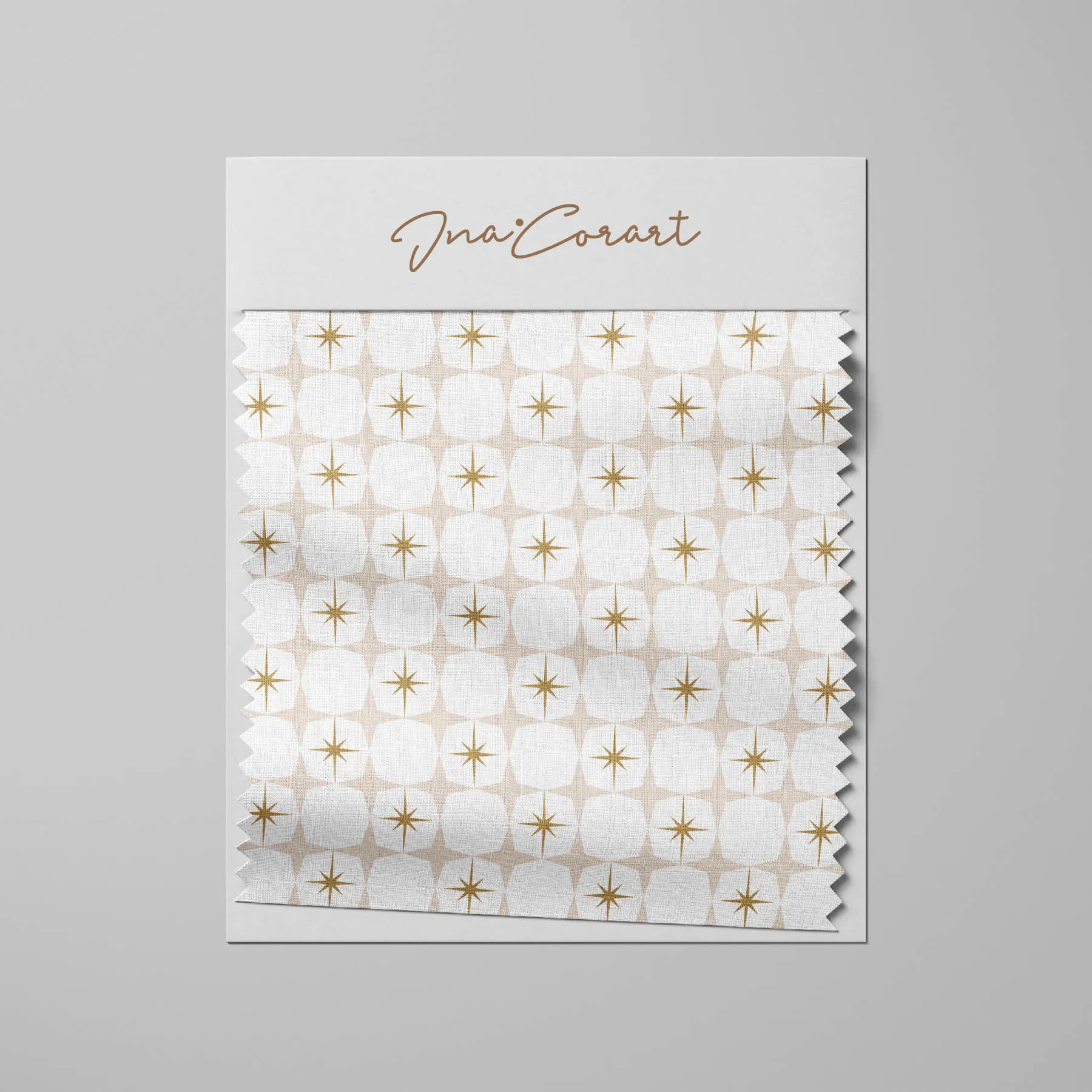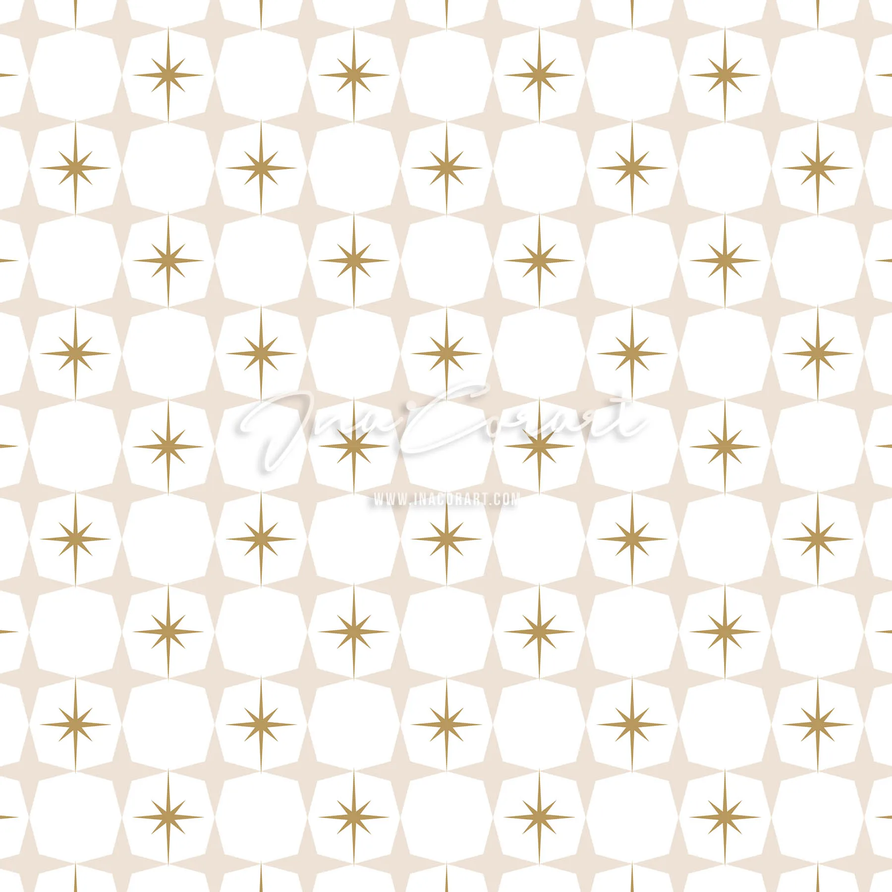 This elegant geometric seamless pattern showcases a series of stars arranged in a harmonious layout. The combination of soft beige and rich gold creates a luxurious feel, perfect for various design projects.
