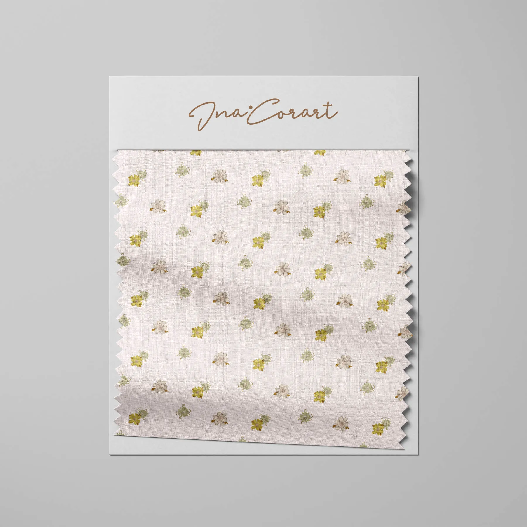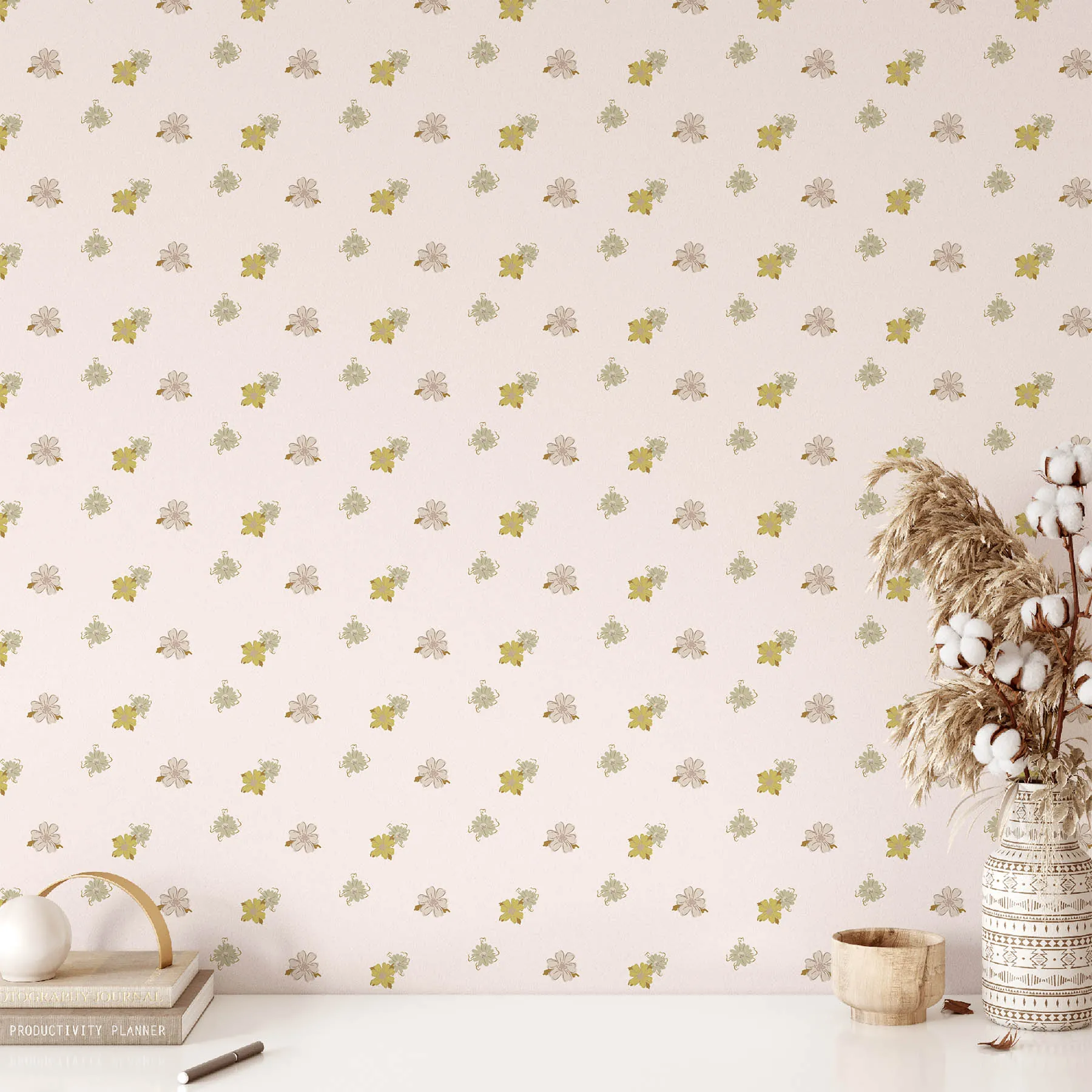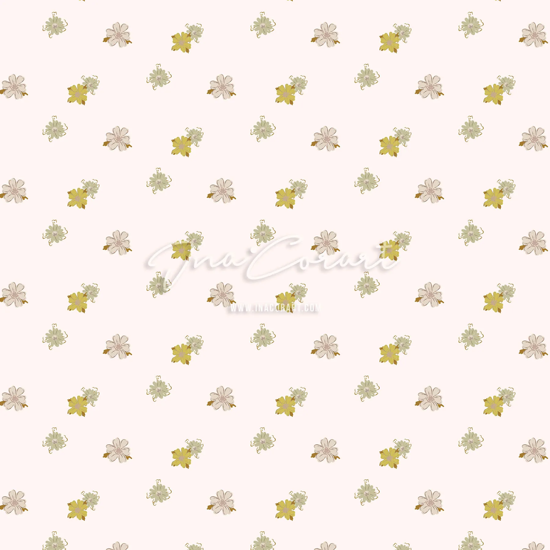 This seamless pattern features delicate flowers in soft hues of green and yellow, set against a light pink background. Perfect for fabric, wallpaper, or stationery, it brings a touch of nature’s beauty to any design project.