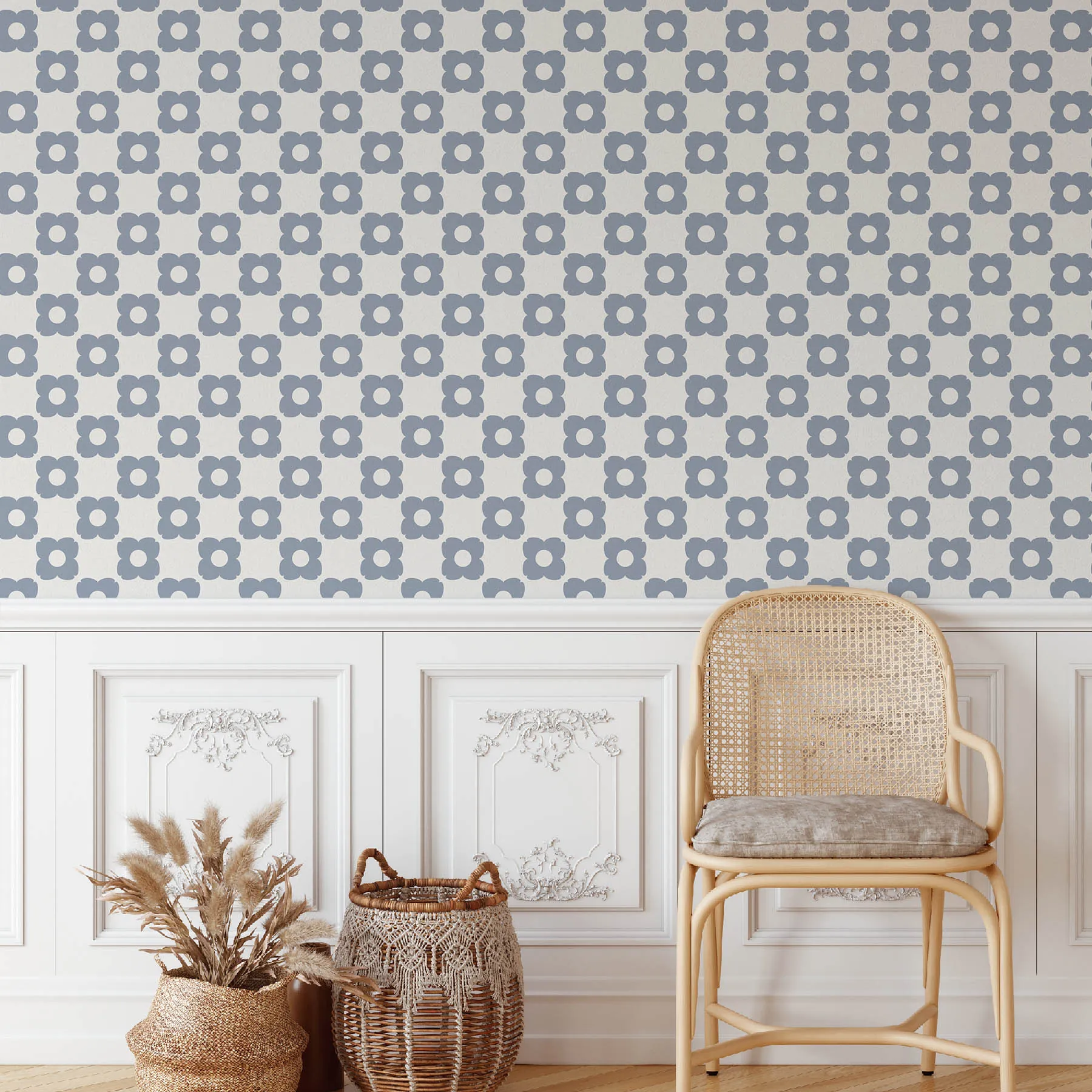 Floral Blue Checkerboard Seamless Pattern