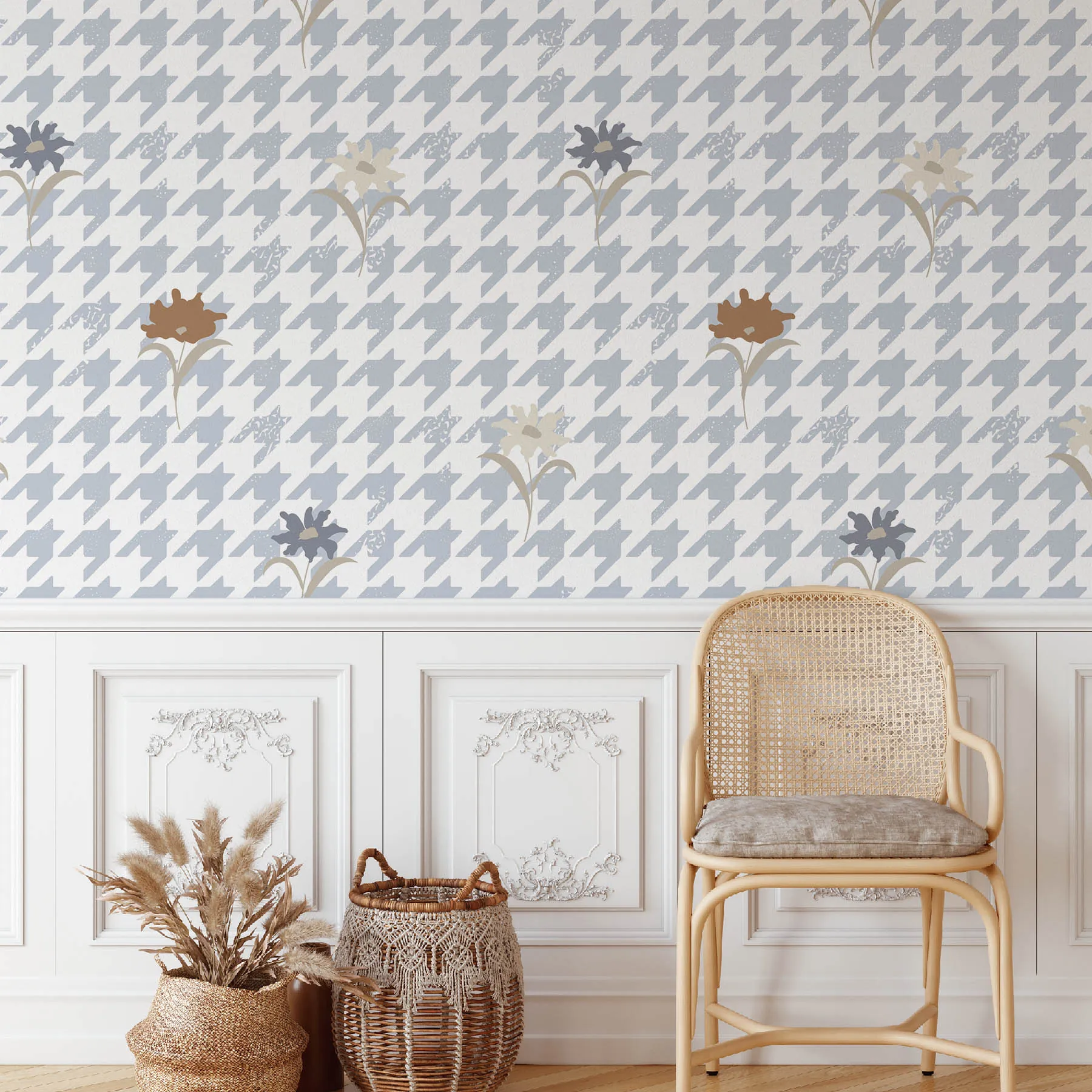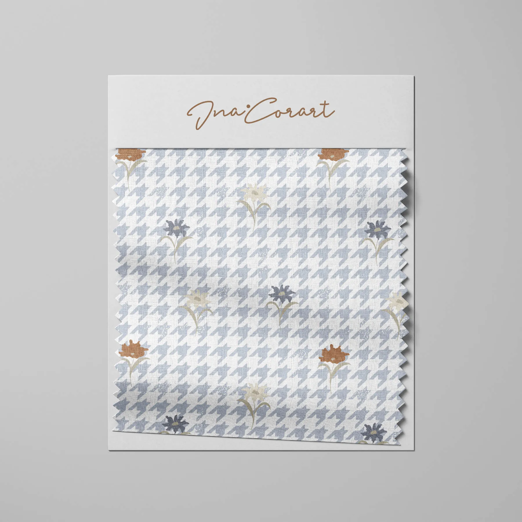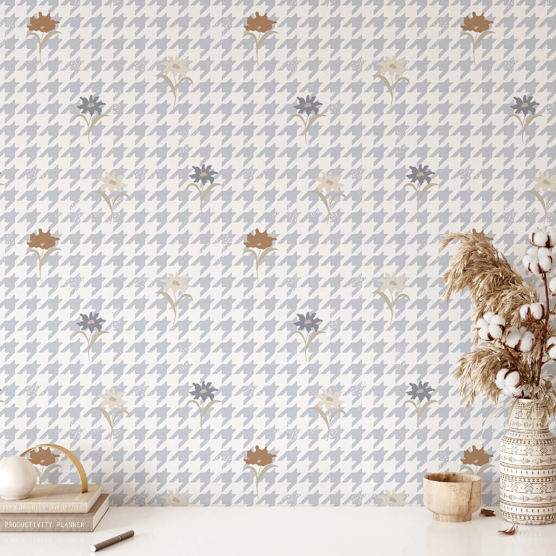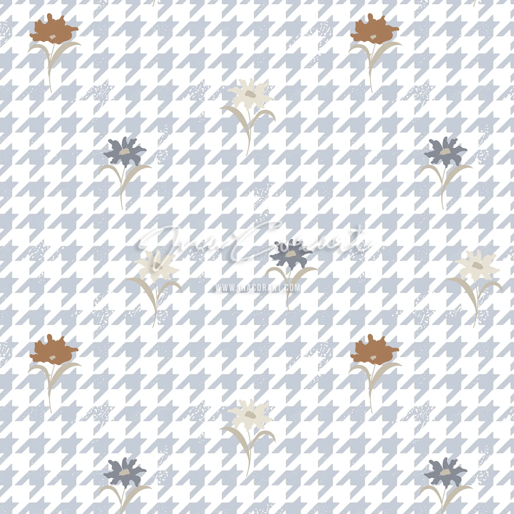 This seamless pattern features a unique blend of floral motifs set against a classic houndstooth background. The soft gray tones combined with earthy floral accents create a sophisticated yet playful design, perfect for various applications from textiles to wallpapers.