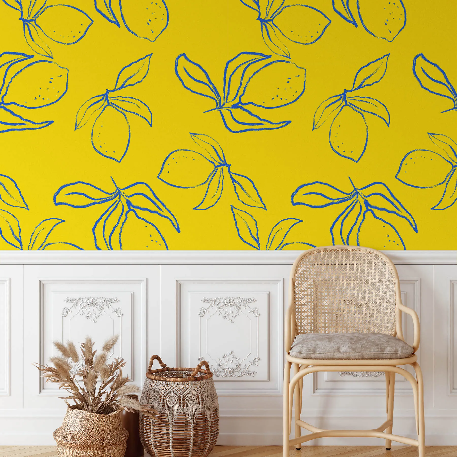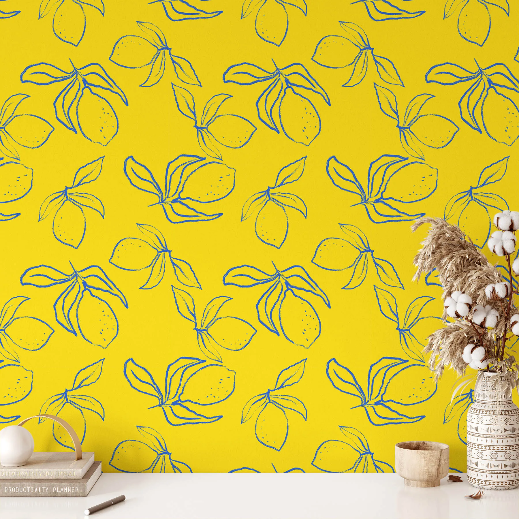 A vibrant lemon pattern on a sunny yellow background.