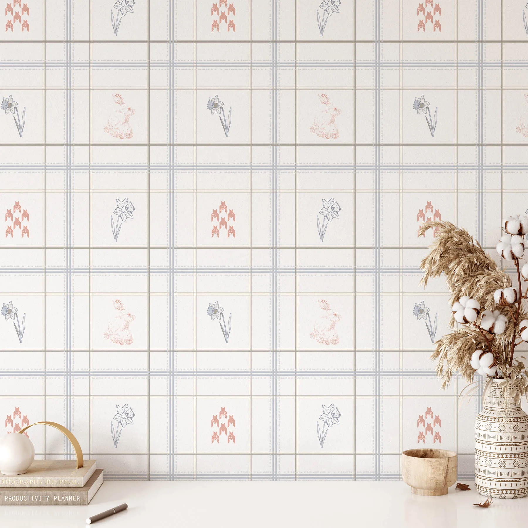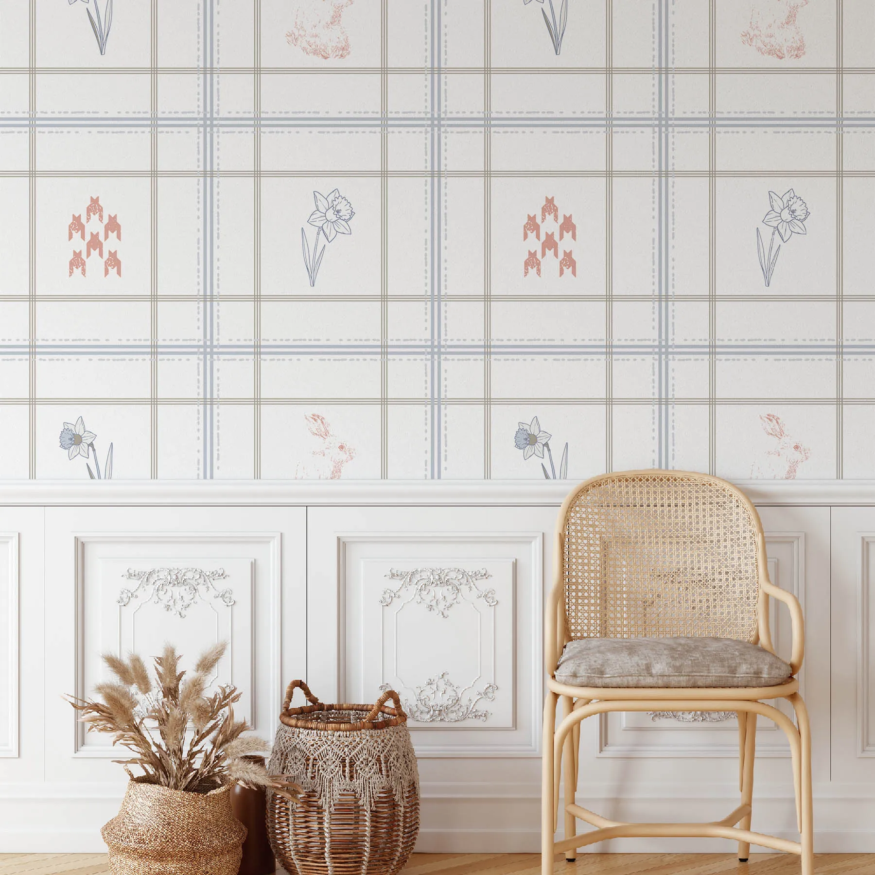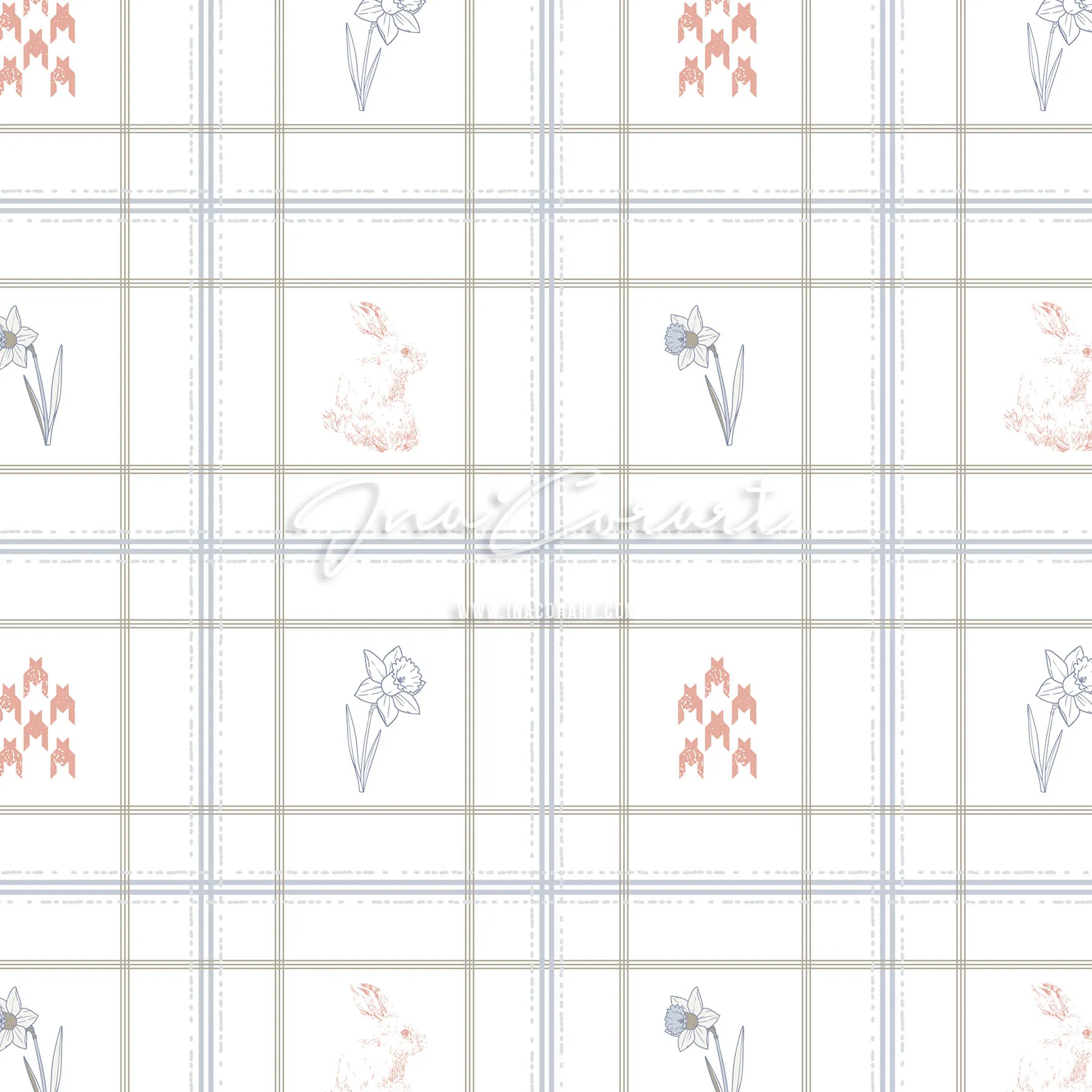 This delightful seamless pattern showcases a blend of delicate daffodils and playful rabbits, perfect for spring-themed projects. The soft color palette and intricate details make it ideal for fabric, wallpaper, and various crafts.