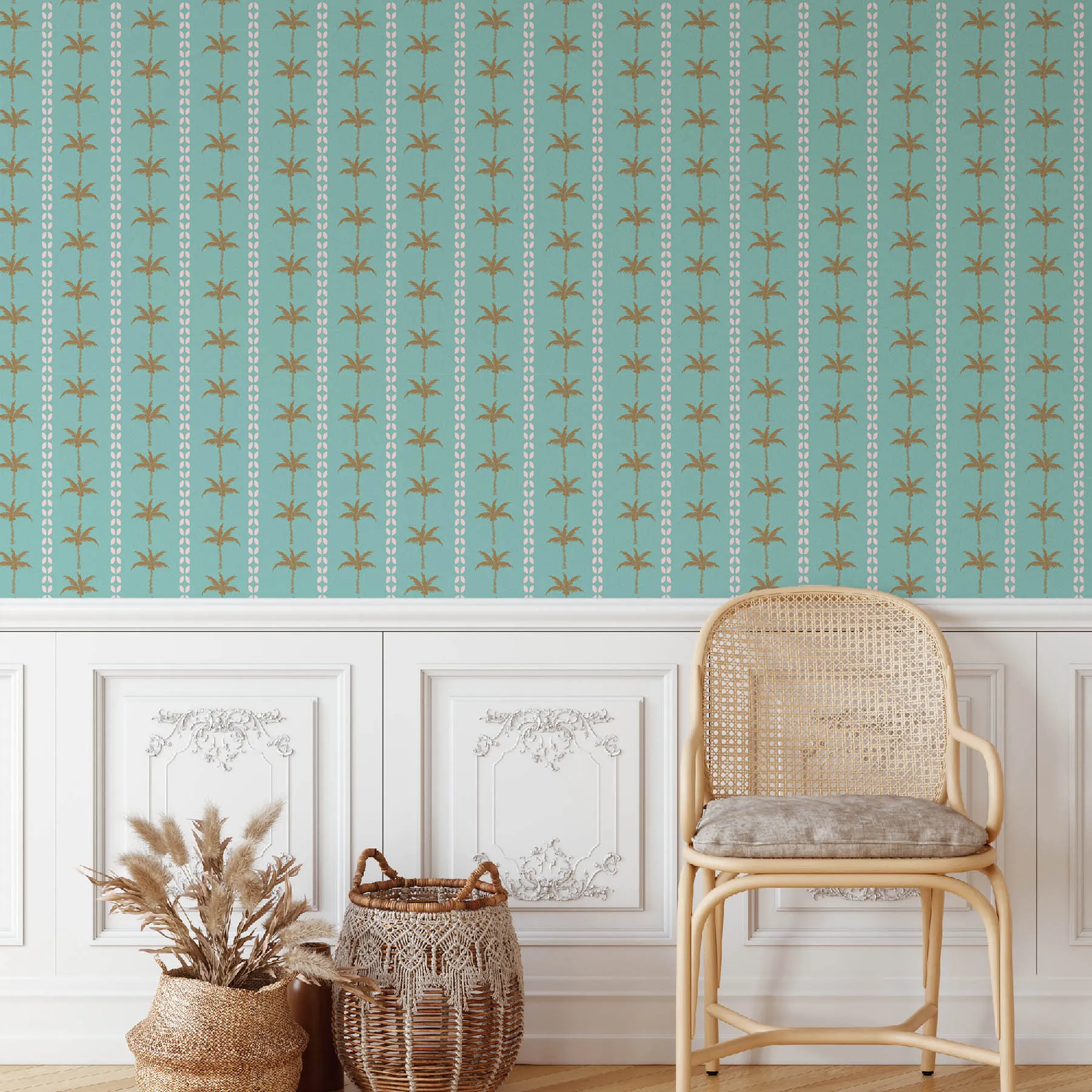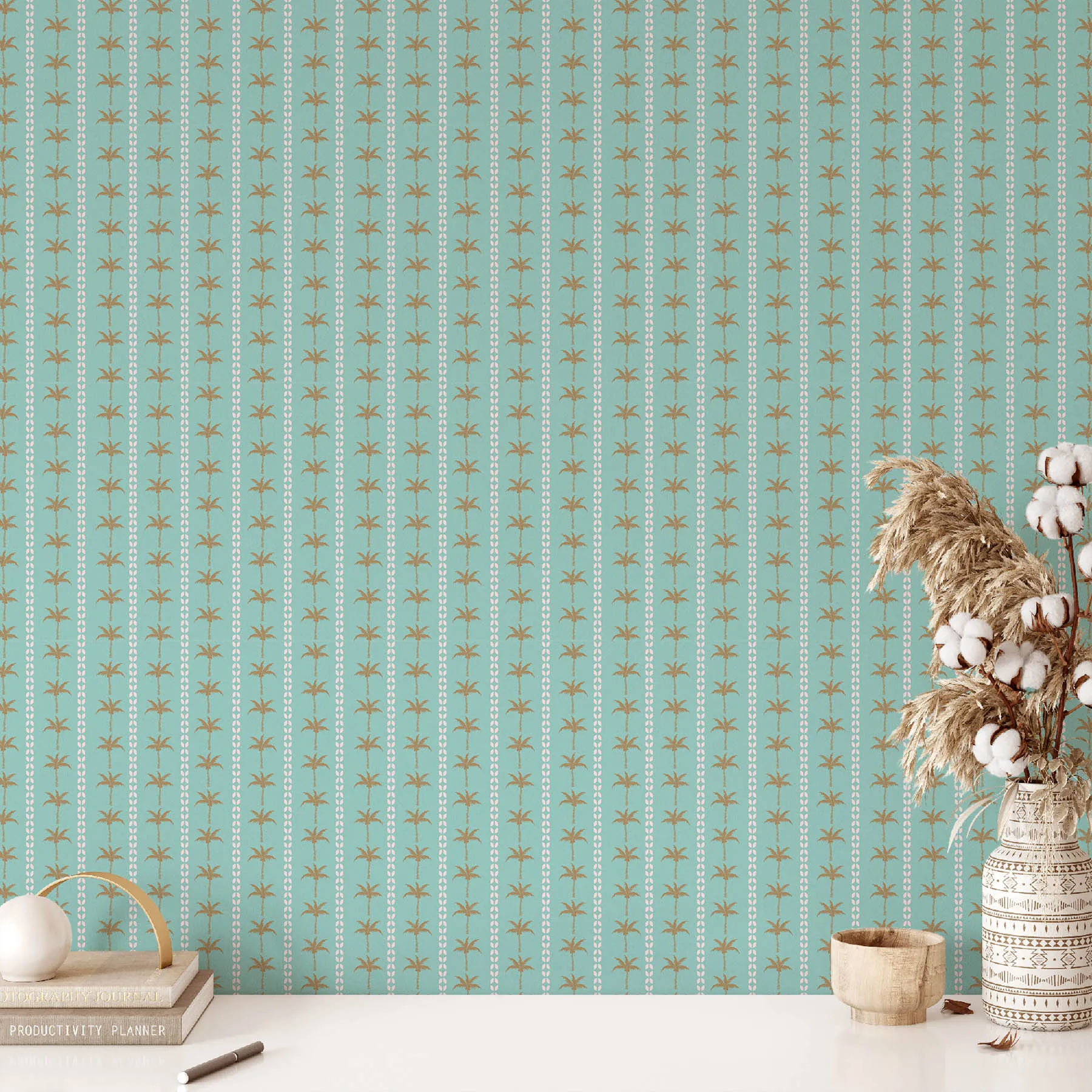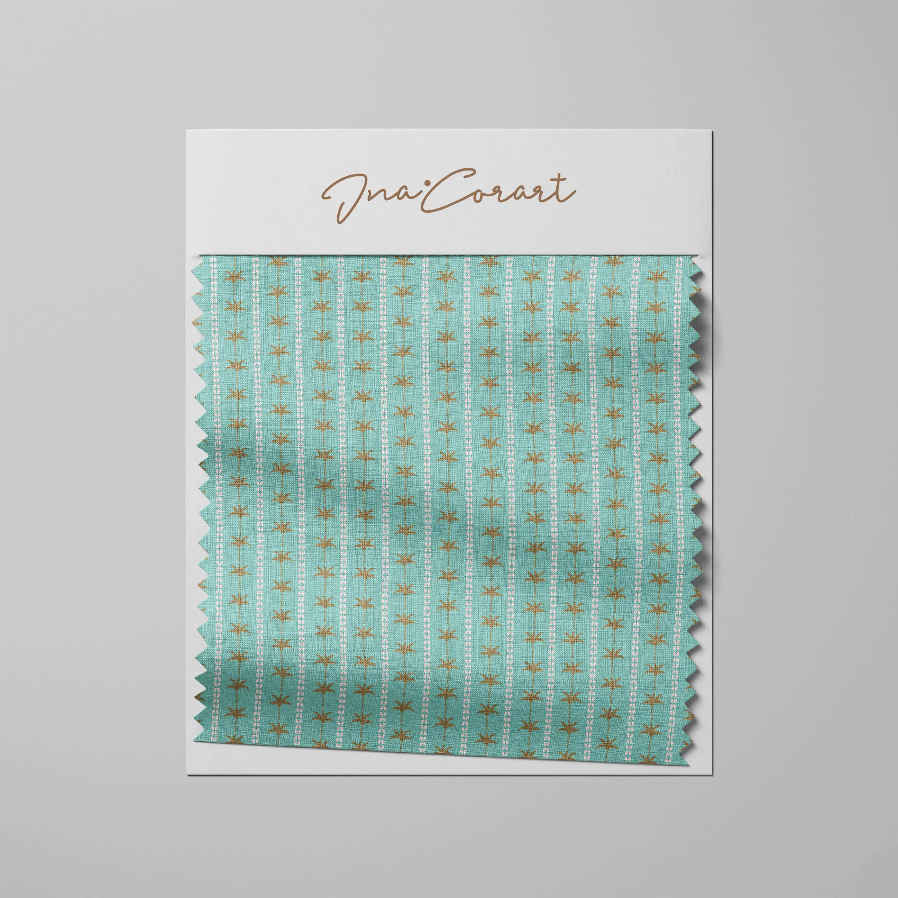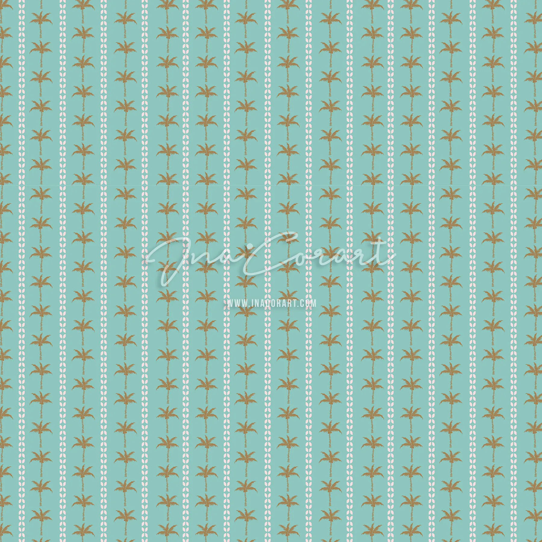This tropical seamless pattern showcases beautifully illustrated palm trees against a calming turquoise background, perfect for summer-themed designs and beach-inspired projects.